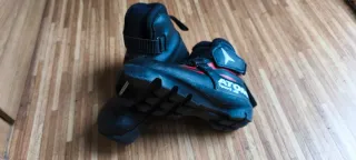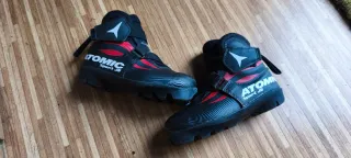 ATOMIC markako haurrentzako iraupen eskiko botak salgai. NNN eta Prolink fijazioetarako. 29 tailakoak. Botas de esqui de fondo niño marca ATOMIC para fijación NNN y Prolink de la talla 29. - Modelo Sport JR. - Cierre con velcro. - Color negro con detalles rojos y logo blanco.