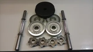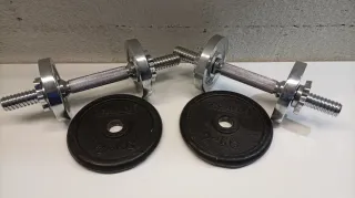 Set de mancuernas y discos para entrenamiento. - Dos barras de mancuerna con rosca. Con sus cierres pesan 2kg cada una - Cuatro cierres de rosca cromados - Cuatro discos cromados de 1.25 kg. - Dos discos de 2 kg.