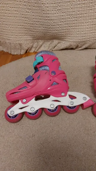 Olson markako patinak, hasiberrientzako. - Neurria egokitzen zaie. 28-31 talla - Kolorea: Arrosa, lila eta turkesa koloreko detaileekin - Gomazko gurpilak - Balazta atzeko aldean - Lila koloreko eramateko poltsa - Galtzerdi pare bat opari __________________ Patines en línea de la marca Olson, ideales para iniciarse en el patinaje. Son ajustables y muy cómodos. - Talla: 28-31 facilmente ajustable - Color: Rosa con detalles en lila y turquesa. - Cierre de hebilla ajustable - Ruedas de goma. - freno trasero - bolsa de transporte lila - 1 par de calcetines de regalo