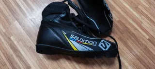 Botas de esquí de fondo marca Salomon, diseñadas para niños y niñas. Son de color negro con detalles en blanco, azul y amarillo. Talla 34. - Cierre con cordones. - Logo de Salomon en el lateral. - Para fijaciones PROLINK.
