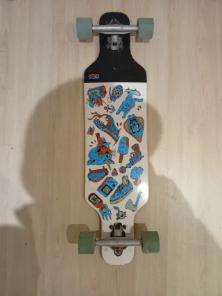 Longboard de la marca Oxelo con un diseño llamativo y ruedas de color verde. - Diseño gráfico original. - Ruedas de color verde.