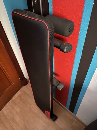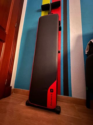 Banco de ejercicios plegable con diseño moderno y acolchado. Muy cuidado y sin señales de uso. - Tapicería negra con detalles en rojo. - Estructura robusta. - Marca: DOMYOS