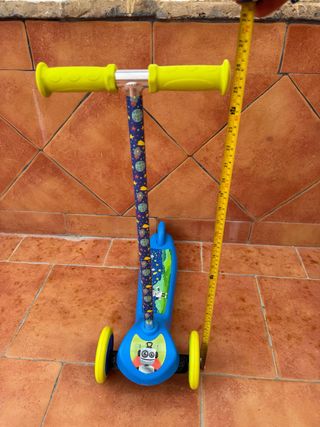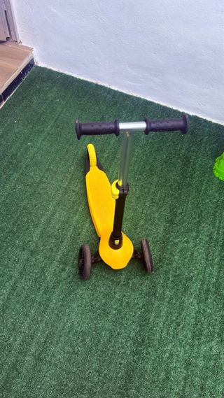 Patinete de tres ruedas en color amarillo. - Plataforma ancha para mayor estabilidad. - Manillar ajustable en altura. - Ruedas delanteras dobles para un mejor control.