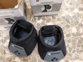 Se venden dos herraduras de goma de la marca Waldhausen. Son ideales para proteger los cascos de los caballos. Están nuevas, se han usado 2 veces. La vendo porque le quedan grandes al caballo que tengo ahora - Color negro. - Cierre de velcro. - Talla 5
