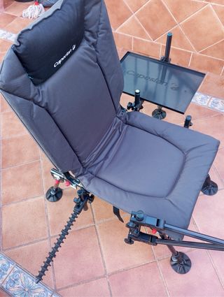 Silla de pesca Caperlan, ideal para sesiones de feeder. Su diseño ajustable permite adaptarla a tus necesidades. PRECIO NEGOCIABLE. Cuenta con un marco de metal fuerte, patas ajustables y pies para barro giratorios, lo que garantiza estabilidad en cualquier superficie. El diseño incluye un respaldo plegable y un asiento acolchado para mayor comodidad. Está diseñada para ser compacta y portátil, facilitando su transporte. - Estructura metálica. - Asiento y respaldo acolchados. - Bandeja lateral. - Reposapiés ajustable.