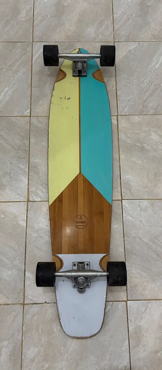 Longboard de la marca Oxelo con un diseño moderno y llamativo. - Tabla con diseño de tres colores: amarillo, turquesa y madera. - Ruedas negras.