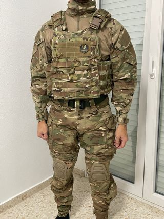 Conjunto de uniforme táctico con estampado Multicam. - Chaqueta con cuello alto y cierre de cremallera. - Pantalones con rodilleras integradas. - Chaleco táctico con múltiples compartimentos y parches.