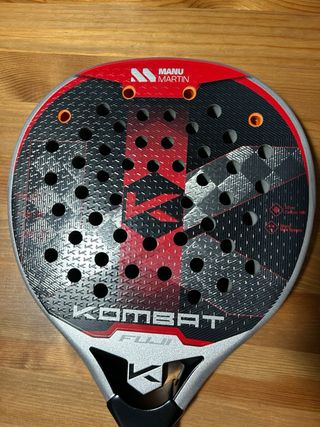 Pala de pádel Kombat Fuji, diseñada en colaboración con Manu Martin. Presenta un diseño moderno y llamativo. - Marco plateado con detalles en rojo y negro. - Superficie con patrón de rombos y líneas. - Logo de Kombat en el centro. - Grip blanco y correa de seguridad.