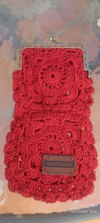 Funda hecha a mano con ganchillo, ideal para proteger tus objetos. 8 con boquilla e hilo 6 con botón y lana - Diseño a cuadros en color burdeos y blanco. - Cierre con botón de madera. - Pequeña etiqueta Made with love.
