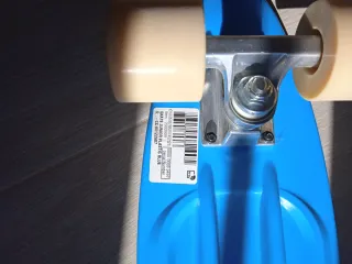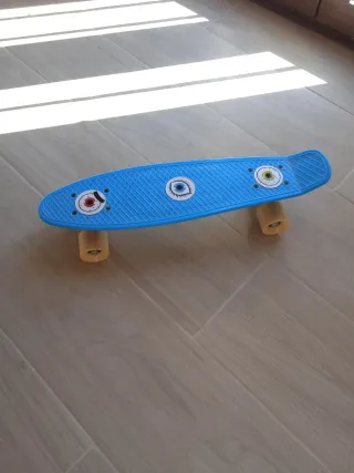 Monopatín skate de color azul de la marca Decathlon. Ideal para iniciarse en el skate. - Diseño llamativo con pegatinas de ojos. - Ruedas de color amarillo. - Tabla con superficie antideslizante.