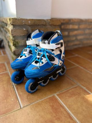 Patines en línea Oxelo en muy buen estado, ideales para aprender y progresar. Son ajustables para adaptarse al crecimiento. - Talla ajustable de 34 a 38. - Diseño en gris y turquesa. - Cierre de velcro y cordones para un ajuste seguro.