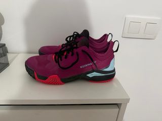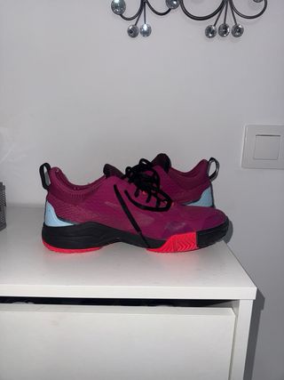 Zapatillas de pádel Kuikma 900 con muy poco uso, prácticamente nuevas. -Talla:40 - Color: Fucsia y negro. - Suela con buen agarre. - Diseño moderno y deportivo.