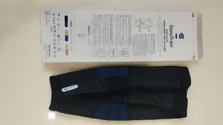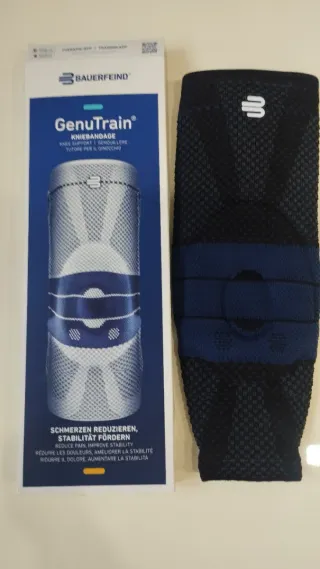 Rodillera de compresión GenuTrain de Bauerfeind. Diseñada para reducir el dolor y mejorar la estabilidad. - Tejido de malla transpirable. - Almohadilla viscoelástica integrada. - Bandas de silicona antideslizantes. Nueva en su caja, sin estrenar.