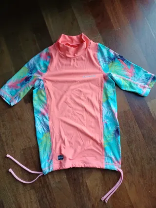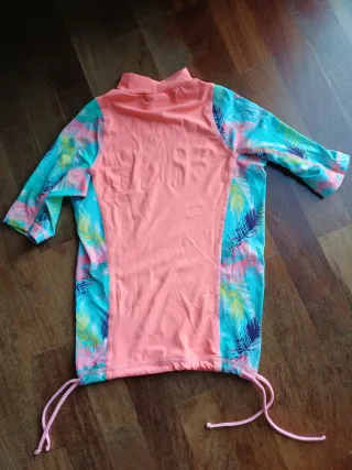 Licra de manga corta con cuello alto y estampado tropical. Muy poco usada. Protecion UV, UPF 50+. - Color principal coral. - Mangas y laterales con estampado de hojas de palmera en tonos turquesa, rosa y amarillo. - Cordones ajustables en la parte inferior. - Largo 47cm - Ancho entre axilas 33cm - Ideal para practica de surf y deportes de agua. Protege del sol y evita rozaduras de tablas de surf y bodyboards.