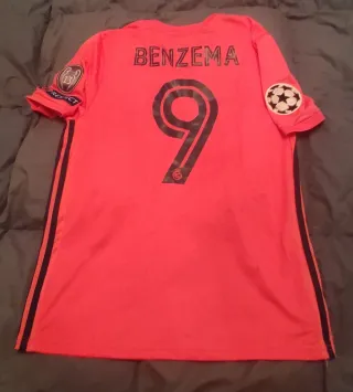 Preciosa camiseta del Real Madrid, conmemorativa del 120 aniversario. Es de color blanco, talla M, y luce el nombre y dorsal de Benzema (9). - Camiseta oficial Adidas. - Incluye detalles conmemorativos del 120 aniversario. - Lleva el logo de la Champions League. - Está nueva sin usar