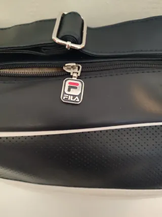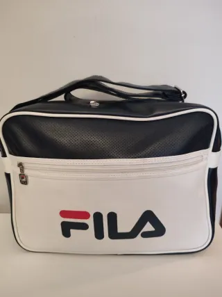 Bolsa de deporte vintage de la marca Fila, con un diseño clásico en color azul marino y blanco. - Medidas: 35 cm de ancho 26 cm de alto 10 cm de fondo - Compartimento principal espacioso. - Bolsillo frontal con cremallera. - Correa ajustable para el hombro. - Logo de Fila en la parte frontal.