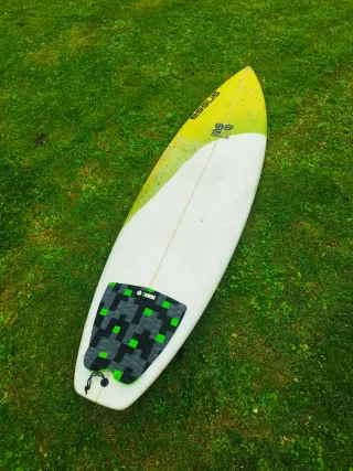 Tabla de surf Essus de 6.4 pies, ideal para disfrutar de las olas. Presenta un diseño degradado en amarillo y blanco en la parte superior, con detalles de salpicaduras. - Tail pad con diseño geométrico en gris, negro y verde. - Leash (cuerda) incluido.