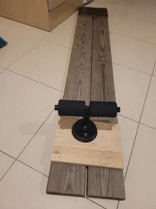 Banco de abdominales hecho a mano, ideal para ejercicios en casa. - Construcción robusta con tablones de madera. - Soporte acolchado para tobillos.