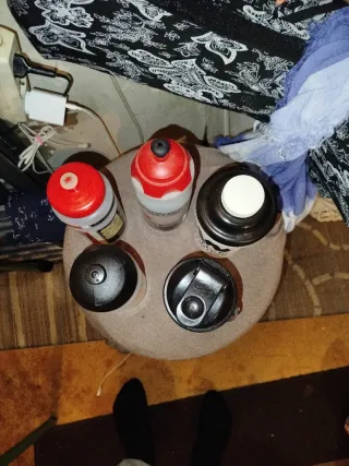 Lote de botellas de agua deportivas. - Botella ProBike transparente con tapa negra. - Botella Myprotein negra con tapa blanca. - Dos botellas más con tapa roja y blanca.