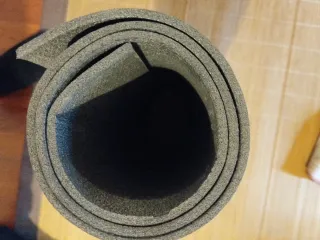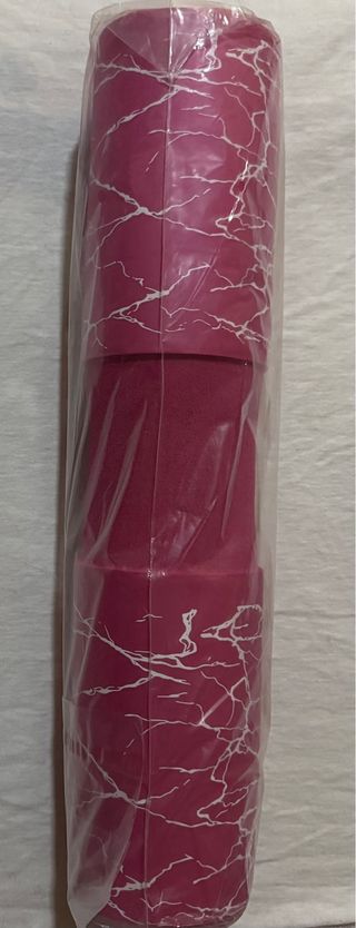 Esterilla enrollable de color negro, ideal para practicar yoga o pilates. Se sujeta fácilmente con una goma elástica rosa. - Material de espuma. - Textura antideslizante.