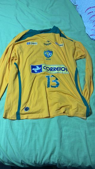 Camiseta de la selección brasileña de futsal. - Color amarillo con detalles en verde. - Manga larga. - Número 13 estampado en la espalda. - Logo de Topper y Correios.