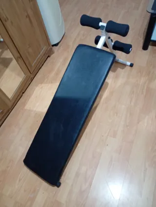 Banco para ejercicios abdominales con acolchado negro. - Estructura metálica blanca. - Acolchado para tobillos y cabeza.