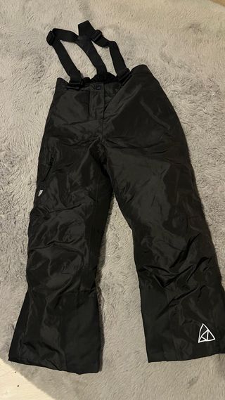 Pantalones de nieve negros con tirantes ajustables. Perfectos para mantenerte abrigado y seco en la montaña. - Color negro. - Tirantes desmontables. - Bolsillo lateral con cremallera. - Logo blanco en el bajo de la pierna. talla 122/128