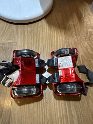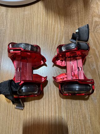 Patines de talón metálicos en color rojo brillante. Cuentan con ruedas y luces que se activan al rodar. No se han usado en la calle nunca. - Diseño metálico. - Ruedas incluidas. - Luces integradas.