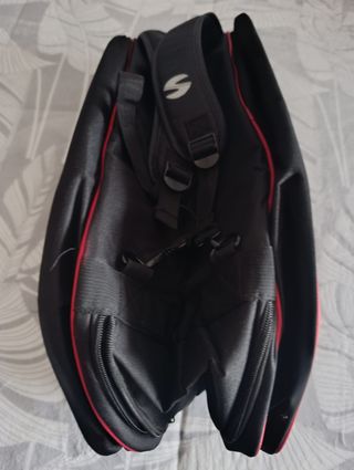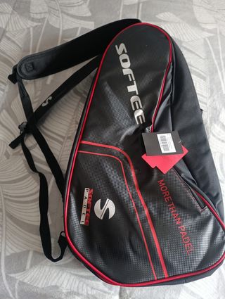 Paletero de pádel de la marca Softee, completamente nuevo y con etiquetas. - Diseño en color negro con detalles en rojo. - Logo de Softee visible. - Correa ajustable para colgar. - Etiqueta de producto adjunta. Compartimento principal amplio para palas y accesorios Bolsillo exterior con cremallera