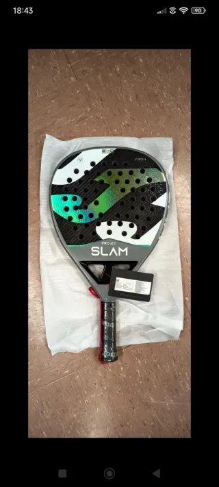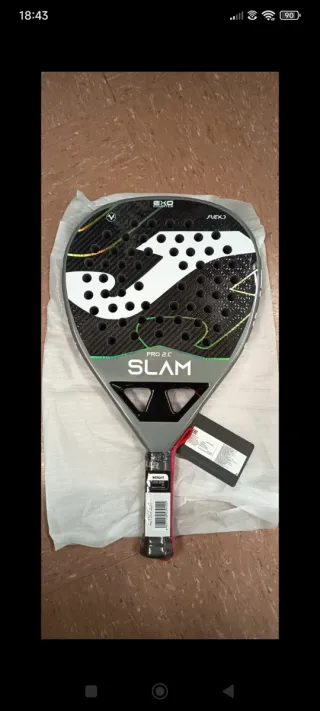 Pala de pádel Joma Pro 2.C. - Diseño con detalles en verde y blanco. - Superficie con agujeros. - Incluye etiqueta. - Mango con cinta roja.
