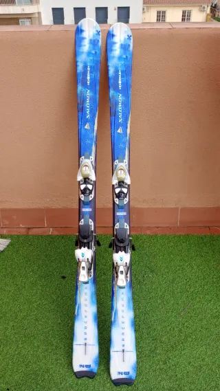 Se venden esquís Salomon de 155 cm de longitud. Diseñados con un patrón azul y blanco. - Fijaciones Salomon incluidas. - Diseño con detalles gráficos. - Longitud: 155 cm. -Los entrego encerados y con cantos hechos
