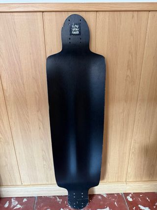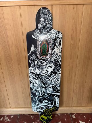 Tabla de skate larga con un diseño gráfico llamativo y detallado en blanco y negro. Presenta una silueta distintiva y arte que evoca elementos de la cultura popular y el arte callejero. - Diseño artístico en blanco y negro. - Forma alargada. - Gráficos detallados. “Venta solo en persona”