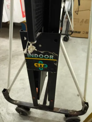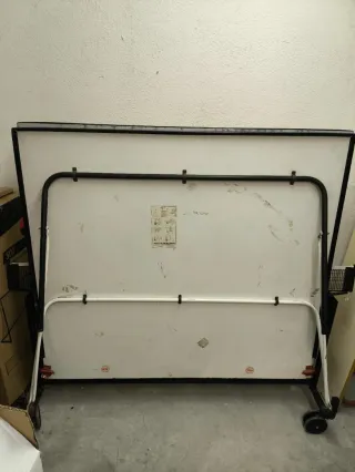 Mesa de ping pong con estructura metálica y ruedas para facilitar su transporte. Se pliega para guardarla cómodamente. - Estructura de metal negro. - Superficie blanca. - Ruedas para movilidad.