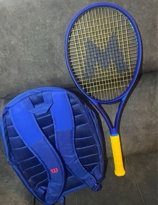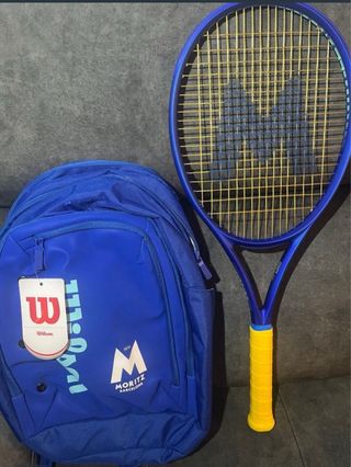 Pack de raqueta de tenis y mochila a juego, ambas de la marca Wilson. - Raqueta de color azul con detalles en amarillo en el grip. - Mochila de color azul con logo de Wilson y otro logo de Moritz Barcelona.