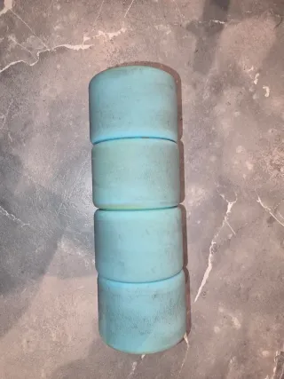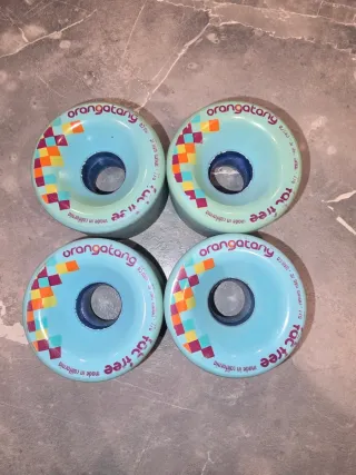 Set de cuatro ruedas para longboard Orangatang Fat Free. Muy poco uso. - Color: Azul claro con diseño de cuadrados. - Diámetro: 65 mm. - Dureza: 77a. - Fabricadas en California.