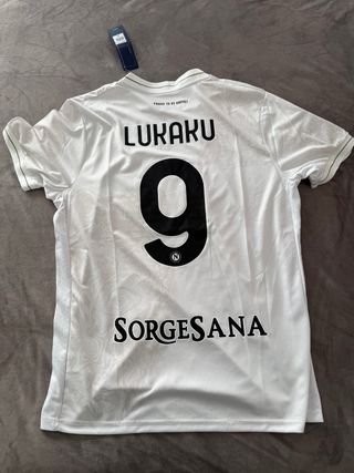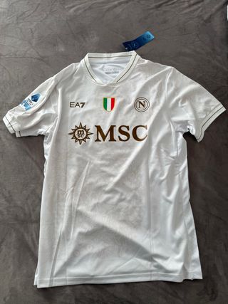 Camiseta oficial del SSC Napoli de la marca EA7. Diseño moderno y cómodo. - Color blanco con detalles dorados. - Escudo del Napoli y logo EA7. - Bandera italiana en el cuello. - Patrón gráfico sutil en toda la prenda. - Dorsal 9 Lukaku.