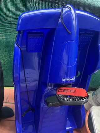 Trineo de plástico azul con volante para deslizarse por la nieve. - Fabricado en plástico resistente. - Incluye volante para dirigir. - Cuerda de arrastre incorporada.
