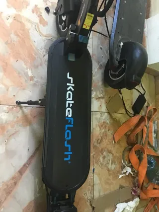 Patinete eléctrico de la marca Flash. Diseño moderno y funcional. - Manillar plegable. - Rueda delantera con suspensión. - Freno de disco delantero. - Detalle de la bandera de España en el guardabarros. La bateria esta muerta para piezas El motor aun vale
