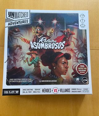 Juego de mesa Unmatched Adventures: Relatos Asombrosos. - Incluye cartas foil exclusivas. - Cooperativo. - Personajes: Annie Christmas, Ögon Bat, Dra. Jill Trent, Nikola Tesla. - Villanos: Hombre Polilla, Invasor de Marte.