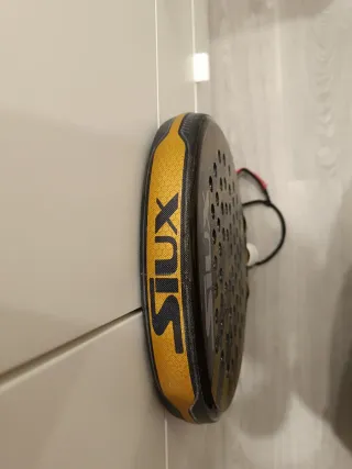 Pala de pádel Siux Electra ST4 PRO con un diseño llamativo. - Superficie con patrón de cuadros dorados y negros. - Logo de Siux en la parte superior. - Nombre 'ELECTRA PRO ST4' visible en la cara. - Grip blanco en el mango. - Correa de seguridad negra con detalle rojo. Solo dos partidos usada para testear ya que me dedico a ello.