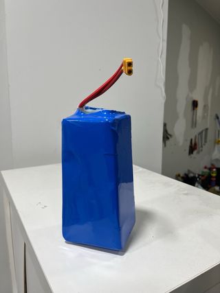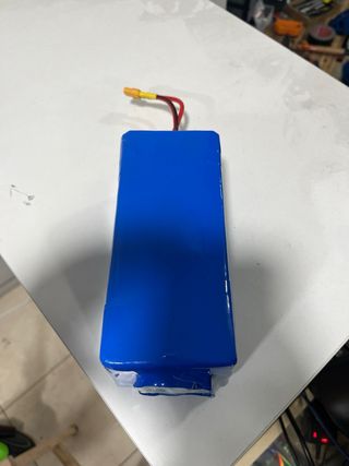 Batería externa para patinete eléctrico, envuelta en plástico azul. -48v10Ah -CELDAS SAMSUNG - Conector tipo XT60. - Cables de conexión rojos. Con menos de 100km