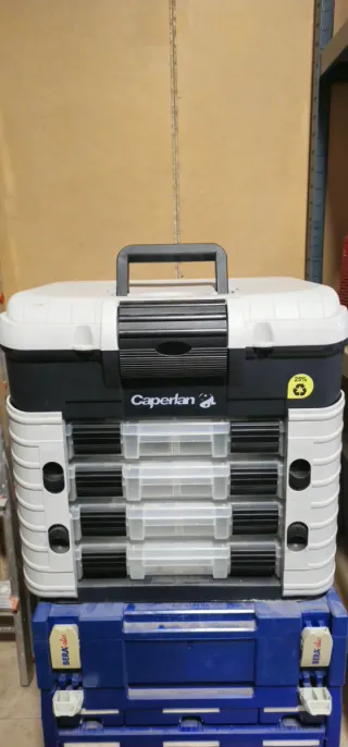 Caja de herramientas utilizada principalmente para la pesca. Contenido: Incluye anzuelos ya montados con hilo (nylon) de la marca Squatina, señuelos, plomos, una linterna verde y otros aparejos pequeños. Organización: Los componentes están ordenados en compartimentos dentro de una caja de plástico. Funcionalidad: Este tipo de equipo permite al pescador tener repuestos listos para diferentes situaciones de pesca.