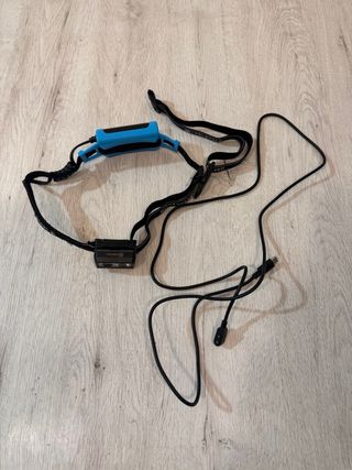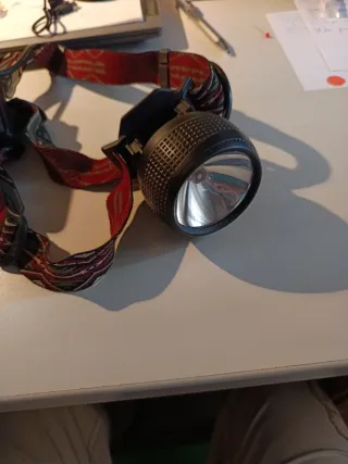 Linterna frontal con diseño moderno y múltiples luces. - Tres luces LED principales. - Dos luces LED auxiliares inferiores. - Correa ajustable para la cabeza. Tiene un pequeño defecto por eso el precio. Solo usada una vez
