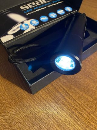 Autonomia 180 minutos. Profundidad máxima 100 metros.Encendido rele accionado por movimiento mecánico.Vidrio de policarbonato transparente. De bolsillo, con 1 led con cuerpo de aluminio anodizado con pulsador en la parte baja. Tres posiciones, potencia máxima, reducida y flash intermitente.Precio no negociable.