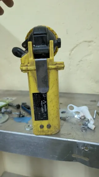 Linterna de la marca Adaro, fabricada en Gijón, España. Un accesorio robusto y funcional. Atex - Cuerpo de plástico amarillo. - Lente circular. - Asa de sujeción negra.