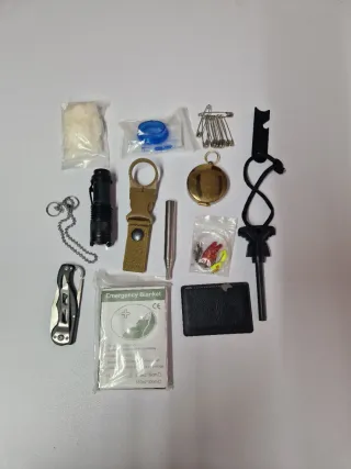 Kit de supervivencia compacto, ideal para llevar en tus aventuras al aire libre. - Incluye linterna. - Incluye brújula. - Incluye silbato. - Incluye pedernal. - Incluye manta térmica. - Incluye multiherramienta.