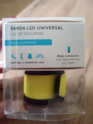 Banda LED recargable para actividades nocturnas al aire libre. Ofrece visibilidad y seguridad. Nueva a estrenar con precintos en la pila. - Colores disponibles: amarillo y azul. Ya que dispongo de varias unidades (hago descuento por varias unidades). - Incluye manual de instrucciones. Tiene doble iluminación, iluminación fija continua y luz flash. Alta visibilidad nocturna Se adaptan a muñeca, brazo, pierna, etc..