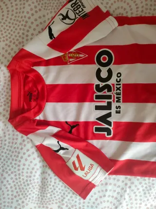 Camiseta de fútbol del Real Sporting de Gijón. - Diseño a rayas rojas y blancas. - Logo de Puma en manga y cuello. - Inscripción JALISCO ES MÉXICO en el frontal. - Detalle LaLiga en la manga.