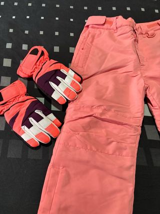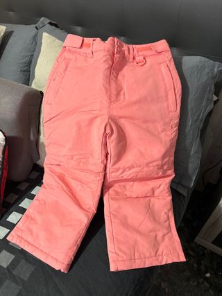 Pantalón de nieve en color coral, ideal para mantener el calor en la montaña. - Talla 3-4 años. - Cierre con cremallera y botón. - Cintura ajustable con velcro. - Bolsillos laterales. - Puños anchos en los bajos. Con guantes de nieve