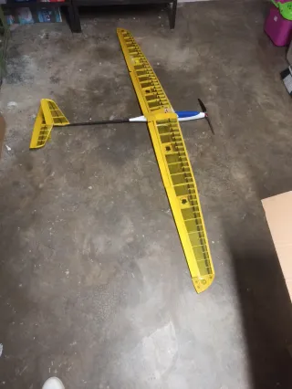 Avión de aeromodelismo tipo planeador de la marca Astra. Su diseño es llamativo en color amarillo. - Envergadura de alas amplia. - Cola en forma de T. - Fuselaje esbelto.